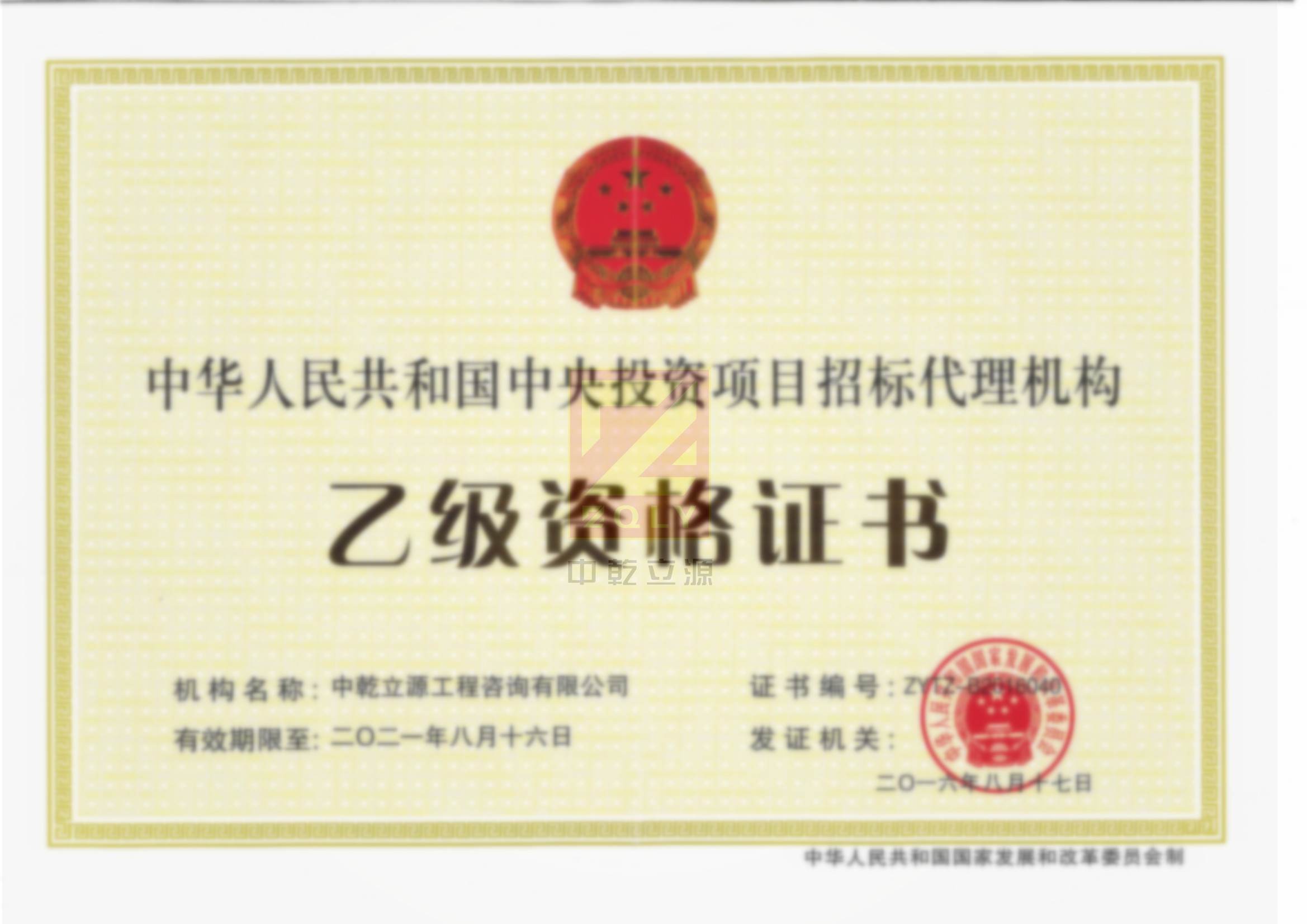 中央投資項目招標代理機構(gòu)乙級資格證書