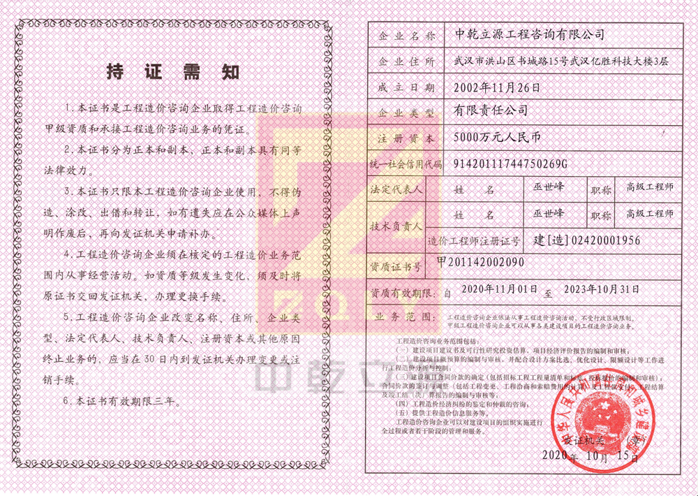 工程造價咨詢企業(yè)甲級資質(zhì)證書