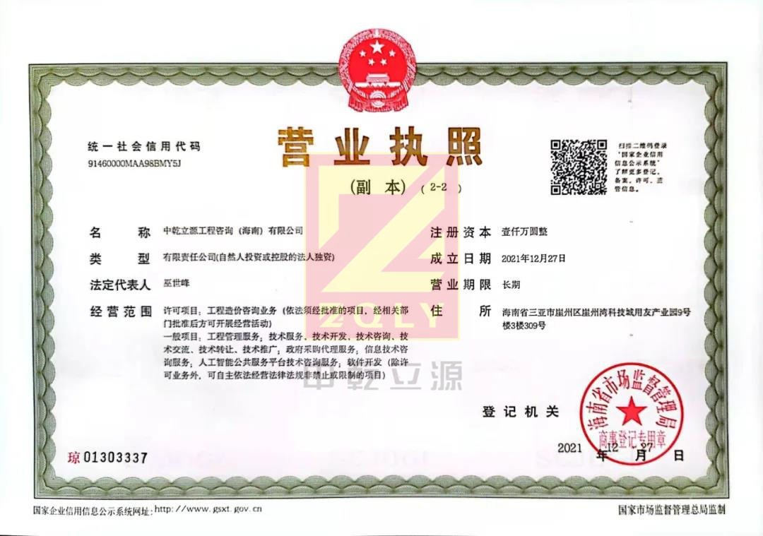 2021年12月27日,為深耕廣闊的海南市場,適應(yīng)公司在全國市場的布局和發(fā)展需要,中乾立源海南公司公司正式注冊(cè),是中乾立源工程咨詢有限公司全資子公司。