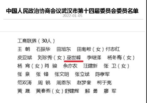 經(jīng)2022年1月4日政協(xié)武漢市第十三屆委員會(huì)第三十次常委會(huì)議審議通過,中國人民政治協(xié)商會(huì)議武漢市第十四屆委員會(huì)委員共有555人,中乾立源董事長、武漢建設(shè)工程造價(jià)管理協(xié)會(huì)會(huì)長巫世峰名列其中。
