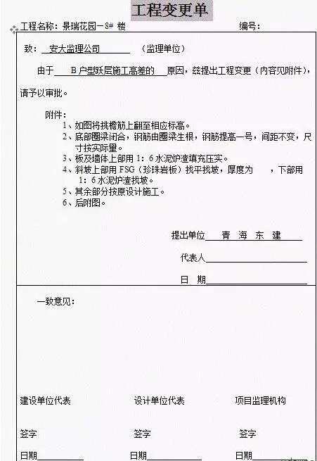 5、客戶要求的變更由營銷部填寫,其余由工程部負責填寫,相關責任人完成,工程部簽發(fā),提出人的要求可另作為本單附件。造價部、審計部門留存原件一份,承包人留存原件兩份,提出部門、工程部、監(jiān)理單位留存復印件一份。變更內容欄打印填寫,手寫及修改無效。