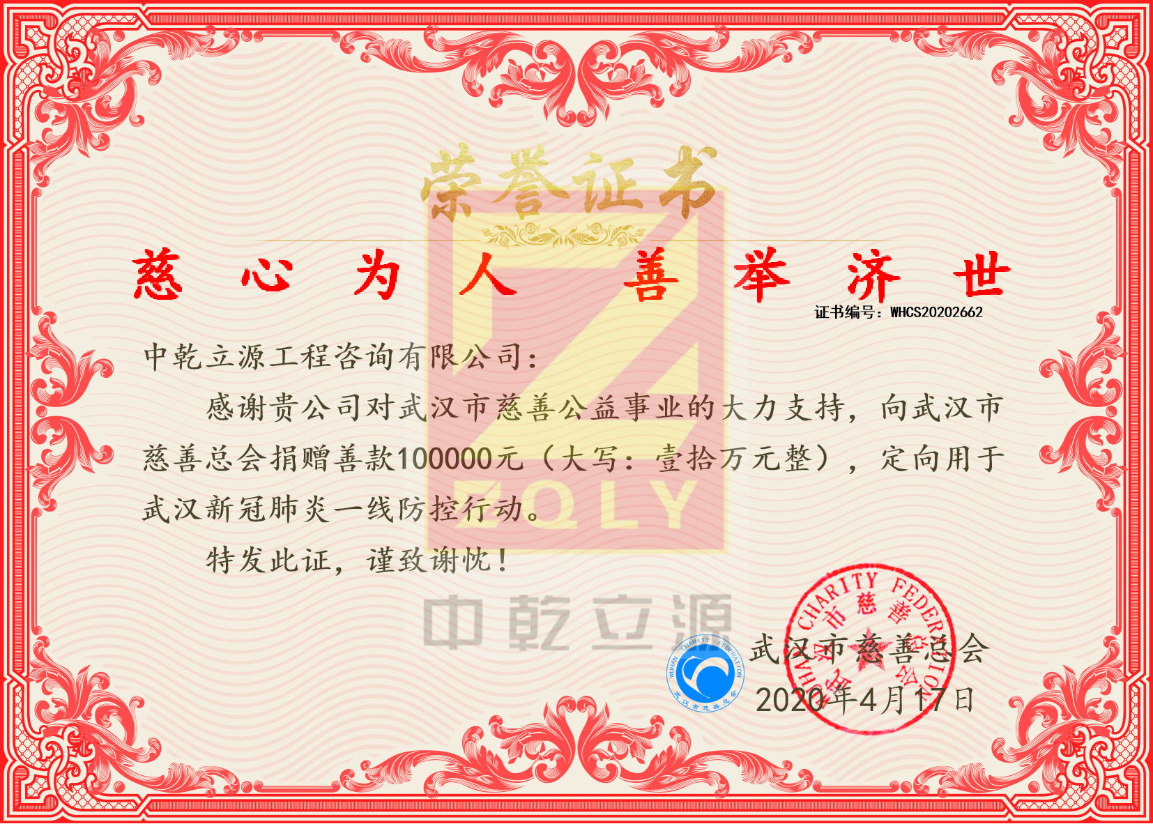 【2020】“慈心為人 善舉濟世” 武漢慈善總會證書