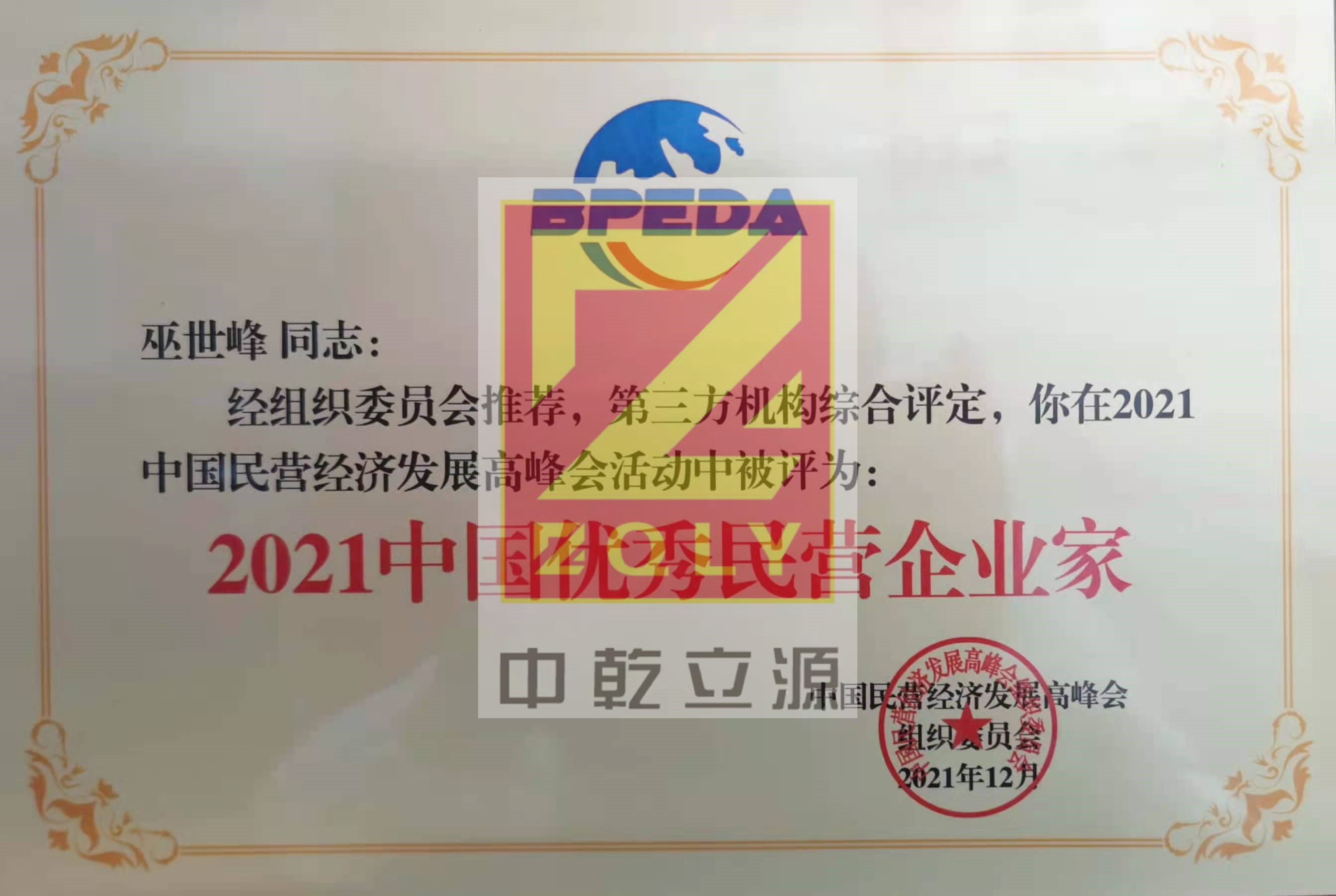 【2022】董事長巫世峰榮獲“中國優(yōu)秀民營企業(yè)家”稱號