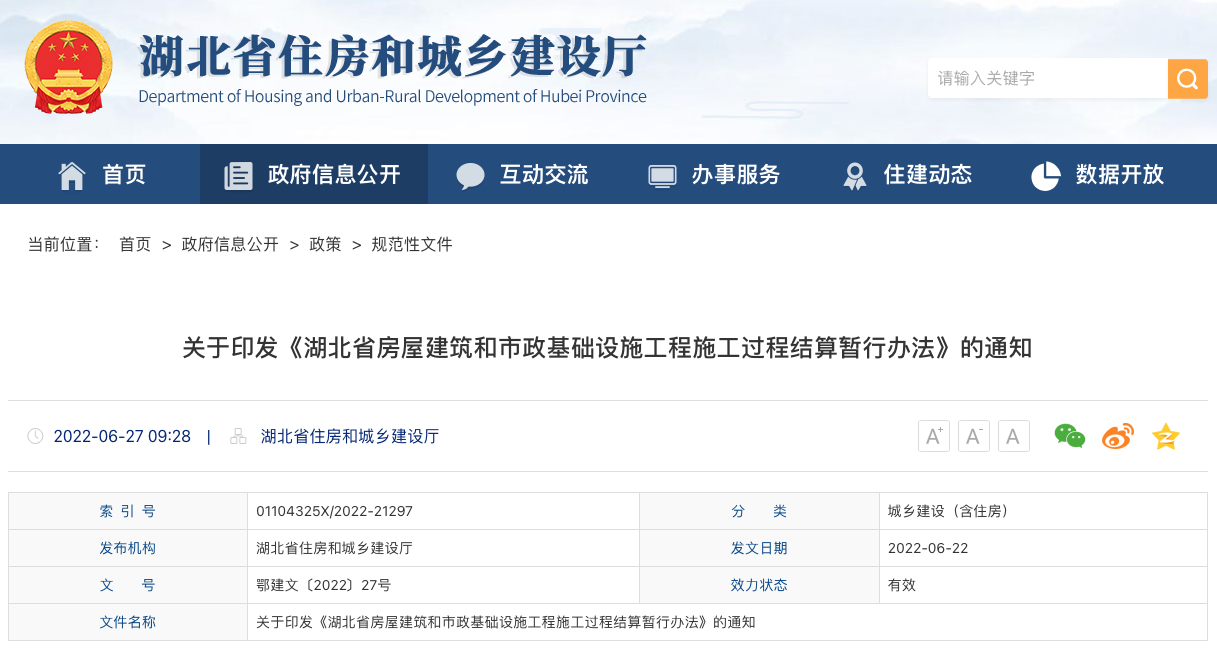 我廳聯(lián)合省財(cái)政廳、省公共資源交易監(jiān)督管理局印發(fā)了《湖北省房屋建筑和市政基礎(chǔ)設(shè)施工程施工過程結(jié)算暫行辦法》(以下簡稱《暫行辦法》)。