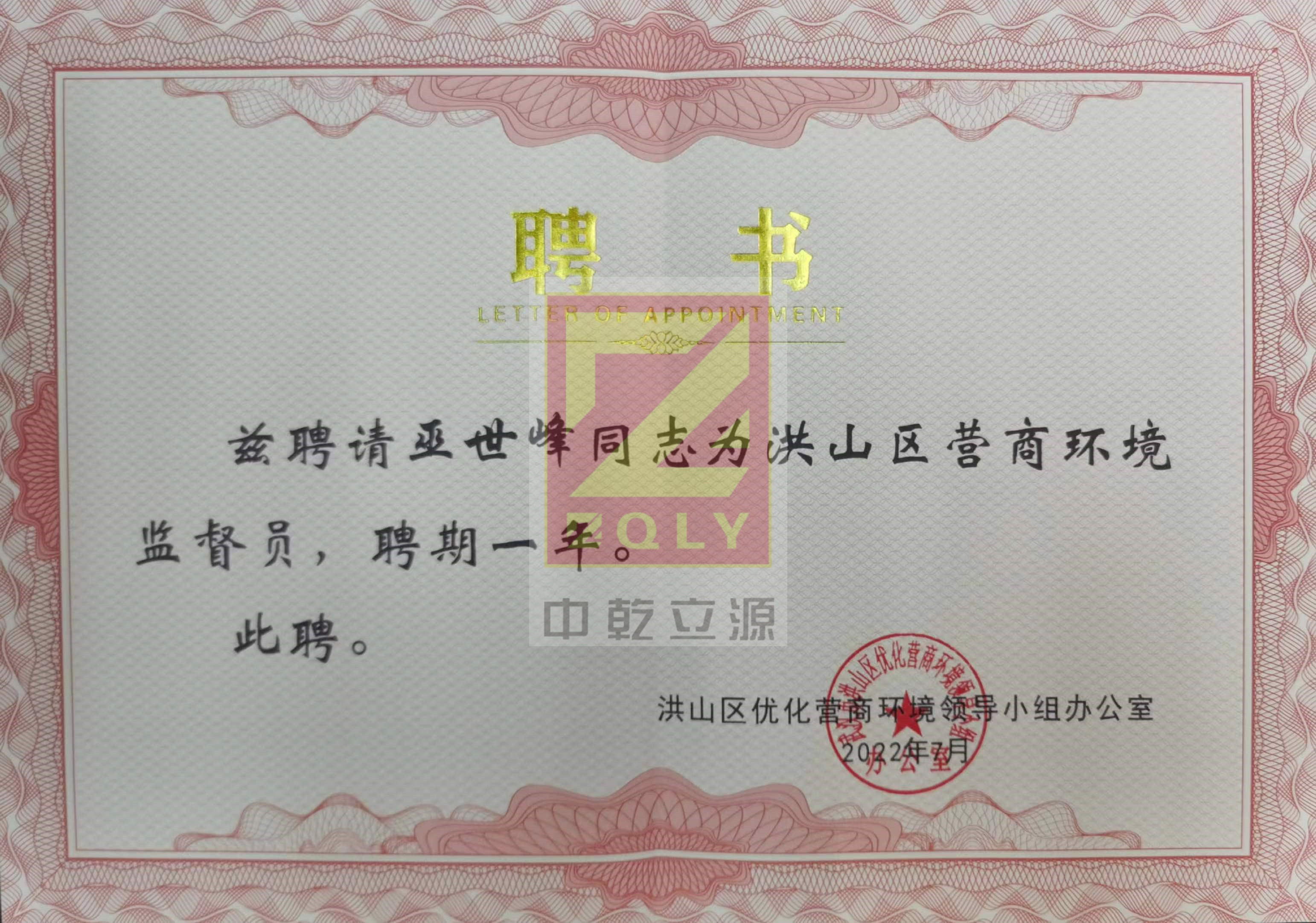 【2022】洪山區(qū)營(yíng)商環(huán)境監(jiān)督員聘書(shū)---巫世峰