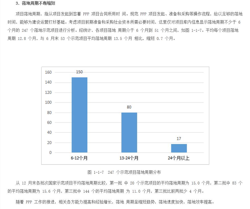 首先,我想告訴大家,PPP在中國還處于探索階段??陀^上,各方面對這個問題的認(rèn)識和實踐能力的提升,都需要一個過程。隨著各項工作的推進,我們國家PPP項目的落地周期已經(jīng)開始縮短,落地的速度也在不斷加快。從財政部示范項目落地的情況看,第一批示范項目的平均落地周期大約是15個月,也就是一年零一個季度。第三批示范項目的平均落地周期已經(jīng)減少到11個月,也就是說,第三批和第一批相比,落地的周期已經(jīng)縮短了4個月。