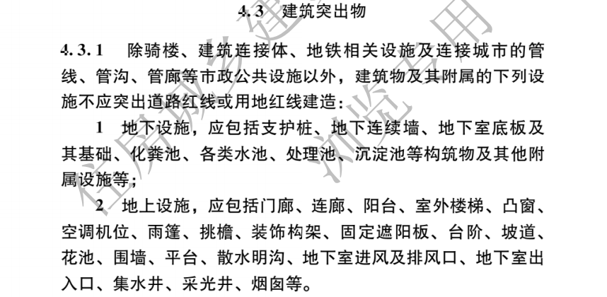 4.3.1除騎樓、 建筑連接體、地鐵相關(guān)設(shè)施及連接城市的管線、管溝、管廊等市政公共設(shè)施以外,建筑物及其附屬的下列設(shè)施不應(yīng)突出道路紅線或用地紅線建造: