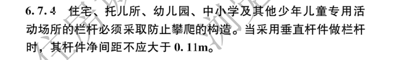 6.7.4 住宅、托兒所、幼兒園、中小學(xué)及其他少年兒童專用活動(dòng)場所的欄桿必須采取防止攀爬的構(gòu)造。當(dāng)采用垂直桿件做欄桿時(shí),其桿件凈間距不應(yīng)大于0. 11m。