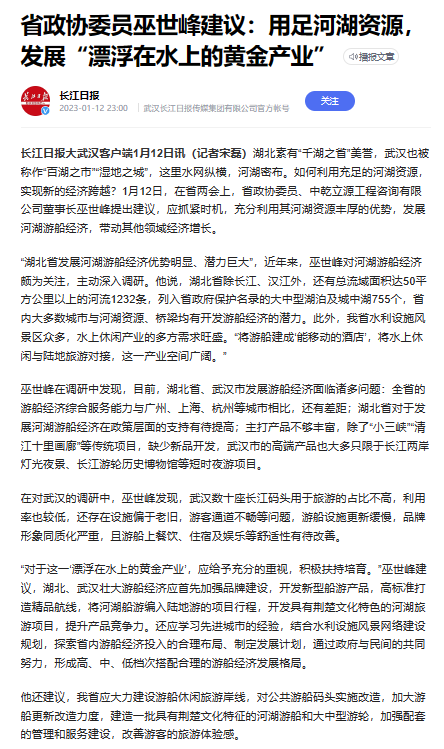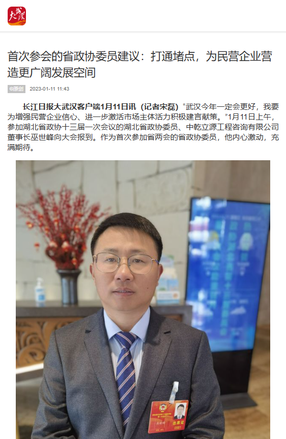 2023年1月11日至16日,政協(xié)湖北省第十三屆一次會議在漢召開。中乾立源董事長巫世峰作為省政協(xié)委員參加了本次會議,提交了《關(guān)于湖北建筑咨詢服務(wù)行業(yè)融入全國統(tǒng)一大市場,優(yōu)化營商環(huán)境的建議》、《關(guān)于發(fā)展湖北省河湖游船經(jīng)濟(jì)的建議》兩份提案,獲長江日報(bào)、中國網(wǎng)、騰訊新聞、人民號、網(wǎng)易新聞、搜狐網(wǎng)等多家媒體報(bào)道。