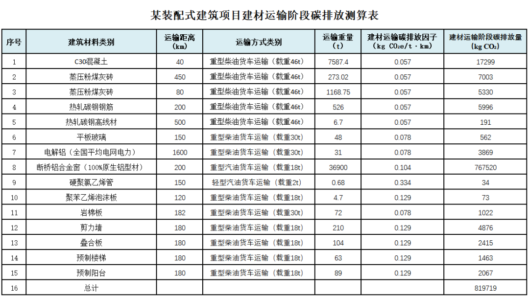 某裝配式建筑項目案例的建筑材料運輸距離、運輸方式、運輸重量如下表所示,建材運輸碳排放因子根據(jù)標準附錄E數(shù)據(jù)計算,可得到建材運輸階段碳排放量(kg CO2)。