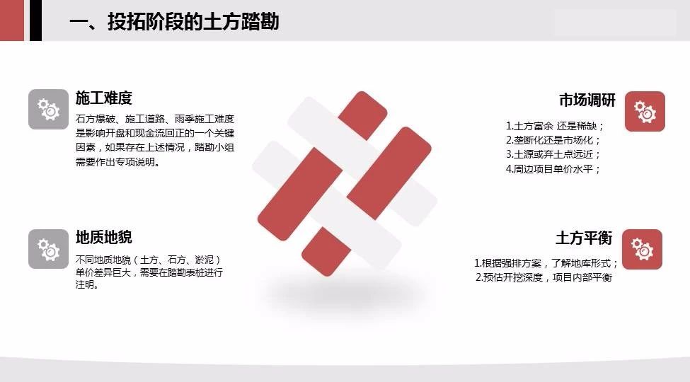 1.投拓前的土方踏勘:施工難度,地質(zhì)地貌,市場(chǎng)調(diào)研,土方平衡,應(yīng)有個(gè)大致的判斷;