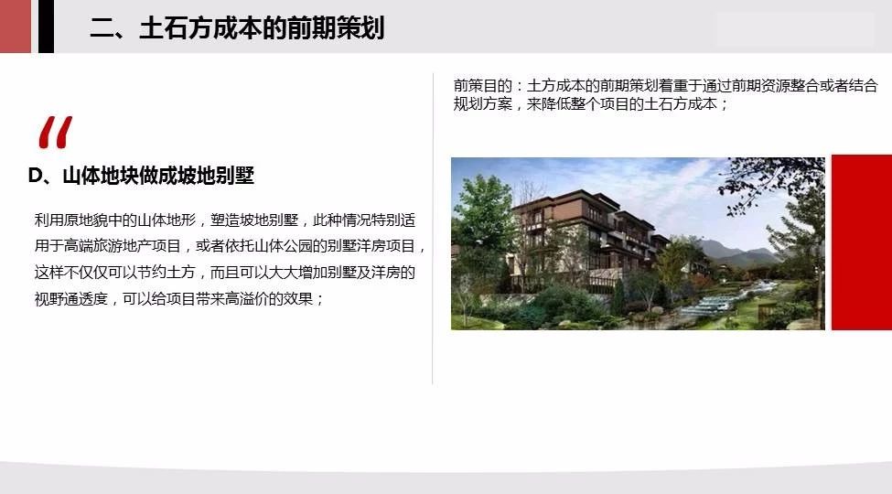 2.土石方的前期策劃:調(diào)研土方稀缺情況相反的項(xiàng)目,土方富余可建議采用微地形,節(jié)地模式可大大節(jié)約土方成本,山體地塊可做成坡地別墅;