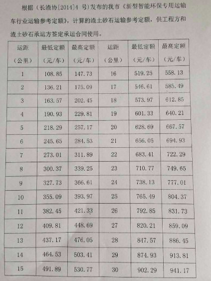 根據(jù)從渣土協(xié)會(huì)調(diào)查得知,對(duì)于新型環(huán)保車,政府指導(dǎo)價(jià),最低108.85元/車起步,每增加一公里,約增加27-28元/車,折合方量為3.5元/m3左右。政府指導(dǎo)價(jià)示例如下:
