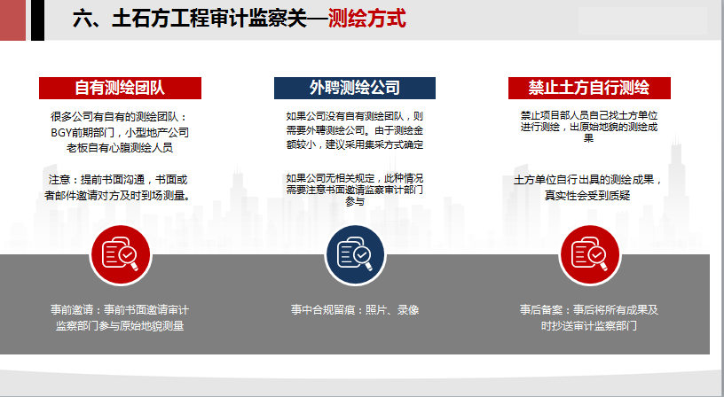 6.土石方監(jiān)察審計(jì)關(guān):測(cè)繪方式,原始地貌,開挖方案,闡述了三個(gè)方面的注意事項(xiàng)