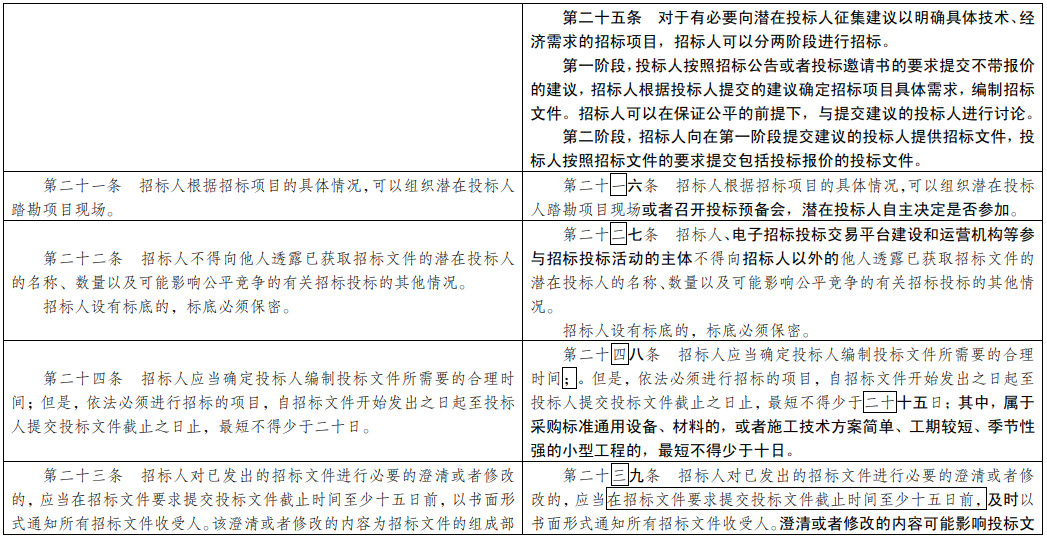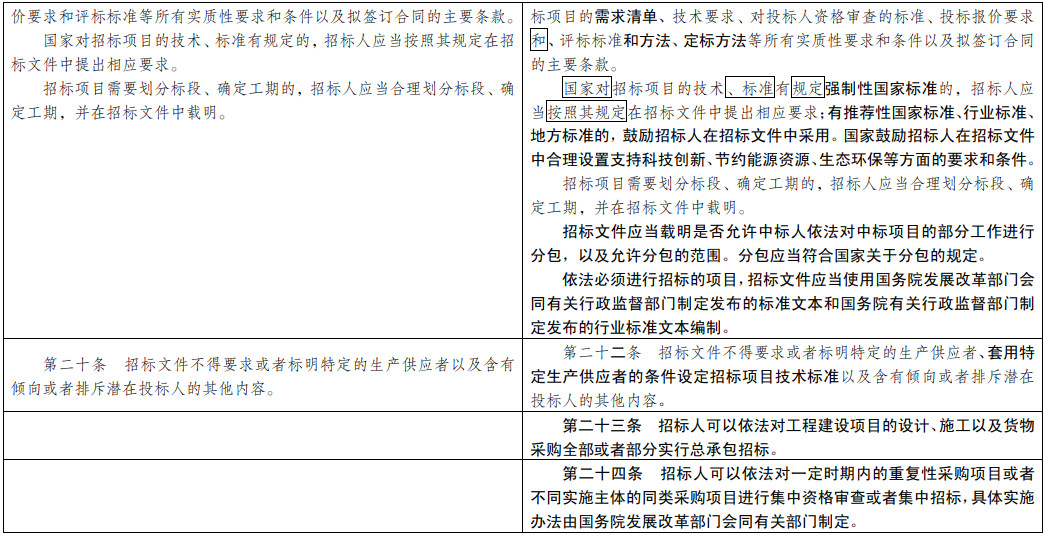 (二)提高招投標(biāo)公開透明度和規(guī)范化水平。大幅增加招標(biāo)公告、招標(biāo)文件、中標(biāo)公示等應(yīng)當(dāng)載明的事項(xiàng)范圍。充分保障潛在投標(biāo)人和投標(biāo)人對(duì)資格預(yù)審、評(píng)標(biāo)、定標(biāo)結(jié)果的知情權(quán)。借鑒國(guó)際慣例首次對(duì)招標(biāo)計(jì)劃公開作出規(guī)定。大力推廣使用標(biāo)準(zhǔn)招標(biāo)文件。