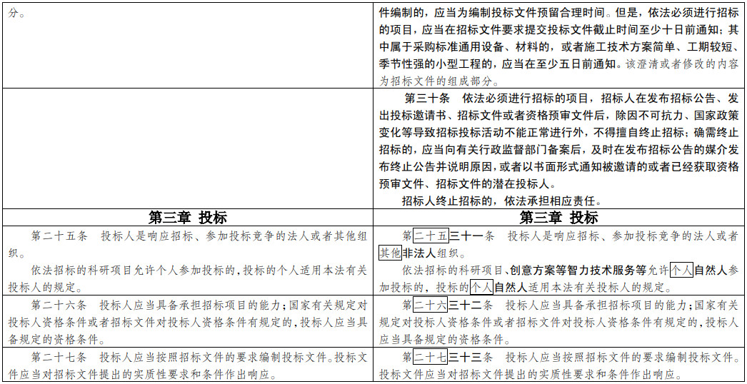 (七)為招投標(biāo)實(shí)踐發(fā)展提供法治保障。明確總承包招標(biāo)、集中招標(biāo)、兩階段招標(biāo)等招標(biāo)組織形式的法律地位。積極促進(jìn)電子招投標(biāo)推廣應(yīng)用。明確政府和社會(huì)資本合作項(xiàng)目遴選社會(huì)資本方有關(guān)招標(biāo)要求。擴(kuò)大了允許自然人投標(biāo)的項(xiàng)目范圍。