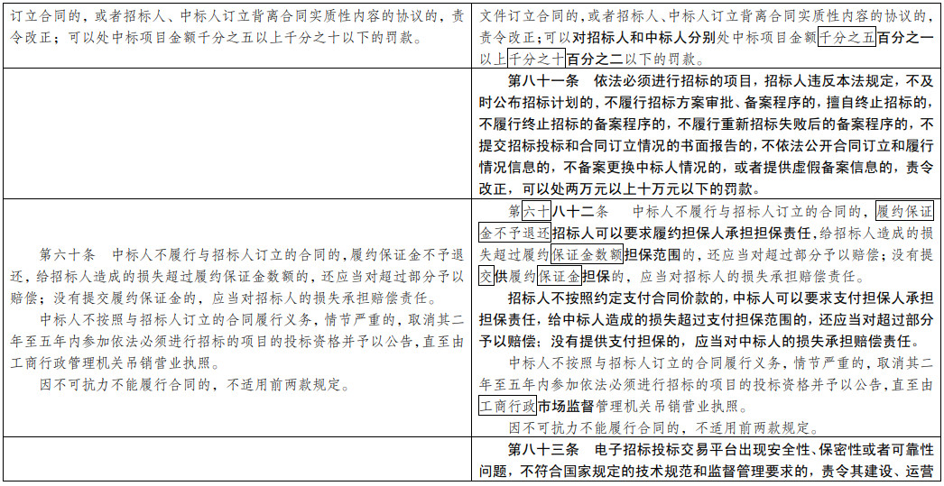 (八)加強(qiáng)和創(chuàng)新招投標(biāo)監(jiān)管。加強(qiáng)招投標(biāo)領(lǐng)域信用體系建設(shè)。強(qiáng)化標(biāo)后合同履行情況監(jiān)管,解決招投標(biāo)與合同履行脫節(jié)問 題。加強(qiáng)對(duì)招標(biāo)代理行為和評(píng)標(biāo)專家行為的監(jiān)管。加大對(duì)圍標(biāo)串 標(biāo)等違法行為懲戒力度。推動(dòng)行政監(jiān)督部門建立抽查檢查機(jī)制。引入仲裁、調(diào)解等多元化糾紛解決方式。同時(shí),對(duì)現(xiàn)行《招標(biāo)投標(biāo)法》未規(guī)定的招標(biāo)終止、異議與投 訴處理程序、招標(biāo)檔案管理、投標(biāo)擔(dān)保和履約擔(dān)保等基本制度作 了補(bǔ)充規(guī)定,對(duì)法律實(shí)施過程中有關(guān)方面理解和執(zhí)行上存在疑問 的規(guī)定作了進(jìn)一步明確。