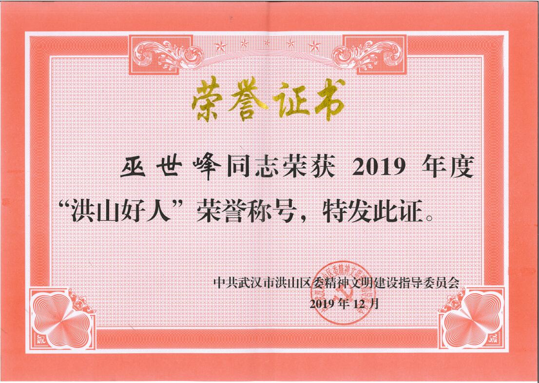 2019年4月,洪山區(qū)委宣傳部、區(qū)委文明辦等部門聯(lián)合組織開啟第六屆尋找“洪山好人”活動,近日,“洪山好人”評選結果揭曉,我司董事長巫世峰先生榮獲2019年度“洪山好人”榮譽稱號,“誠信,責任,感恩”是巫世峰先生創(chuàng)辦企業(yè)的初心,巫世峰先生秉持初心,始終站在資助貧困生的前列,幫助了數百位貧困學子,彰顯了一個責任企業(yè)家的風采。