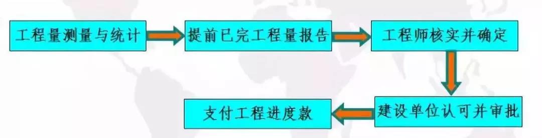 按月進(jìn)行結(jié)算,要對(duì)現(xiàn)場(chǎng)已施工完畢的工程逐一進(jìn)行清點(diǎn),資料提出后要交建設(shè)單位審查簽證。為簡(jiǎn)化手續(xù),多年來(lái)采用的辦法是以承包商提出的統(tǒng)計(jì)進(jìn)度報(bào)表為支取工程款的憑證,即通常所稱(chēng)的工程進(jìn)度款。工程進(jìn)度款的支付步驟,見(jiàn)圖所示。