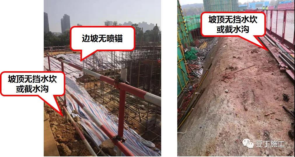 危大基坑未按設(shè)計圖紙進行噴錨施工,或超?;游窗丛O(shè)計圖紙進行有效放坡,基坑周邊均有施工道路或建筑物等,項目匯報原因為甲指分包或場地道路、高壓線等影響,項目未取得設(shè)計或業(yè)主同意擅自進行變更,雨季來臨,未形成有效的降排水措施,存在安全風(fēng)險。