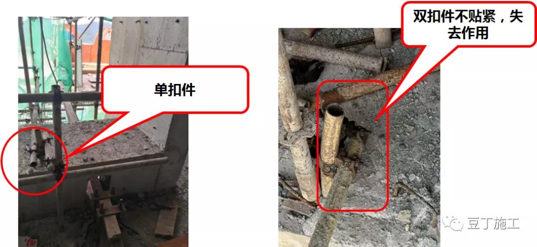 采用預(yù)埋短鋼管的連墻件,不按方案設(shè)置雙扣件,或雙扣件設(shè)置不合理。