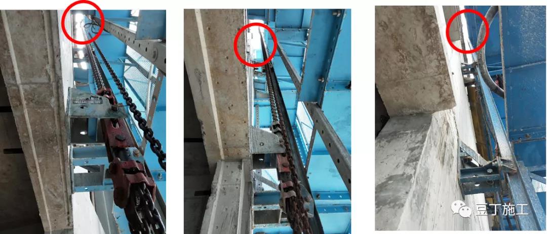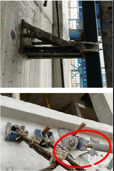 鋼絲繩使用不規(guī)范:采用卸扣和拉環(huán)拉結(jié)、共用拉環(huán)、用一根繩對折使用、與結(jié)構(gòu)摩擦無隔離。