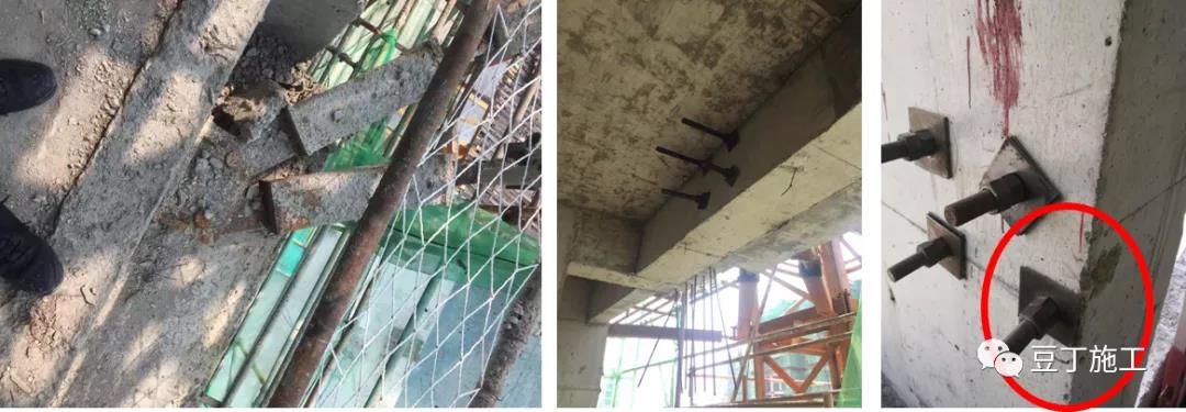 附著預(yù)埋螺桿數(shù)量與方案不符,方案為六根螺桿,實際為四根。附著螺栓邊緣混凝土太薄,不能有效固定附著支座